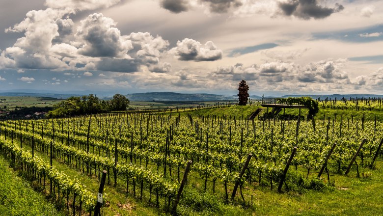 Die 7 Meter hohe Skulptur aus 130 scheinbar schwebenden Eisenkugeln mitten im Weingarten ist ein Werk des bedeutenden österreichischen Künstlers Heimo Zobernig und wird von den Einheimischen liebevoll „Traube am Käferberg“ genannt.